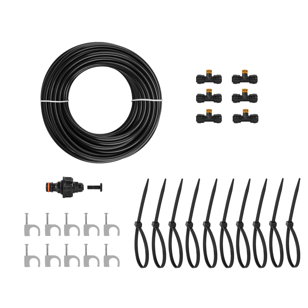 Dank des Standard-Gartenschlauchanschlusses mit Filter sowie der mitgelieferten Befestigungsclips und Kabelbinder ist dieses Set in wenigen Minuten installiert. Der verstellbare Sprühwinkel und die leicht zu reinigenden Düsen machen das System besonders benutzerfreundlich. Zudem wirkt es insektenabweisend und hilft, Staub aus der Luft zu filtern.