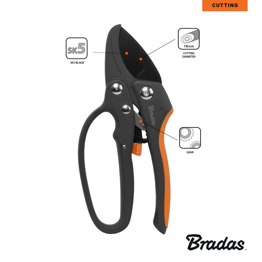 Diese Gartenschere aus der Bradas V-SERIES ist ideal für alle, die Blumen, Äste und Sträucher präzise und mühelos schneiden möchten. Dank der 4-fach-Ratschenübersetzung lassen sich Äste bis 18 mm Durchmesser mit minimalem Kraftaufwand schneiden. Das Ambossmesser besteht aus hochwertigem SK5-Stahl mit einer schützenden Beschichtung, die Rost verhindert und langanhaltende Schärfe garantiert.