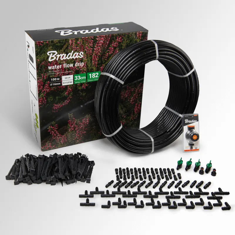 Entdecken Sie das komplette Bradas Tropfschlauch-Bewässerungssystem mit 100 Metern – die ideale Lösung für eine effiziente, wassersparende und zeitsparende Gartenbewässerung. Dieses umfangreiche Set mit insgesamt 182 Teilen ist perfekt geeignet für Einsteiger und erfahrene Gärtner, die Blumenbeete, Gemüsegärten oder Obstpflanzen optimal bewässern möchten.