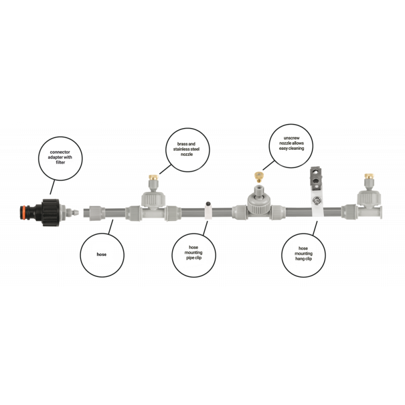Dieses komplette Wassernebelsystem von Bradas wurde speziell entwickelt, um die gefühlte Temperatur im Garten oder auf der Terrasse um bis zu 10–12 °C zu senken. Mit 7 Messingdüsen, einem Endstück und stabilen Befestigungsclips lässt sich das System einfach entlang einer Pergola, eines Sonnenschirms oder Zauns installieren. Der feine Nebel kühlt die Luft, ohne alles nass zu machen – perfekt für Sommertage, an denen Sie draußen entspannen möchten.
