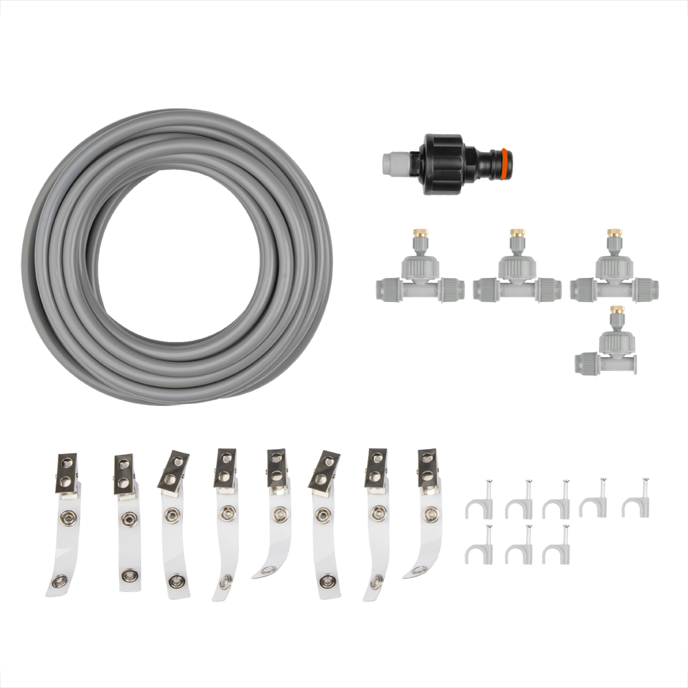 Dank des verstellbaren Sprühwinkels und des einfachen Anschlusses an Ihren Gartenschlauch oder Außenwasserhahn ist das Set schnell einsatzbereit. Die mitgelieferten Clips ermöglichen eine ordentliche und sichere Montage unter einem Sonnenschirm, an einer Pergola oder entlang eines Geländers. Ideal für kleinere Außenbereiche oder als kompakte Lösung bei einer Loungegruppe.