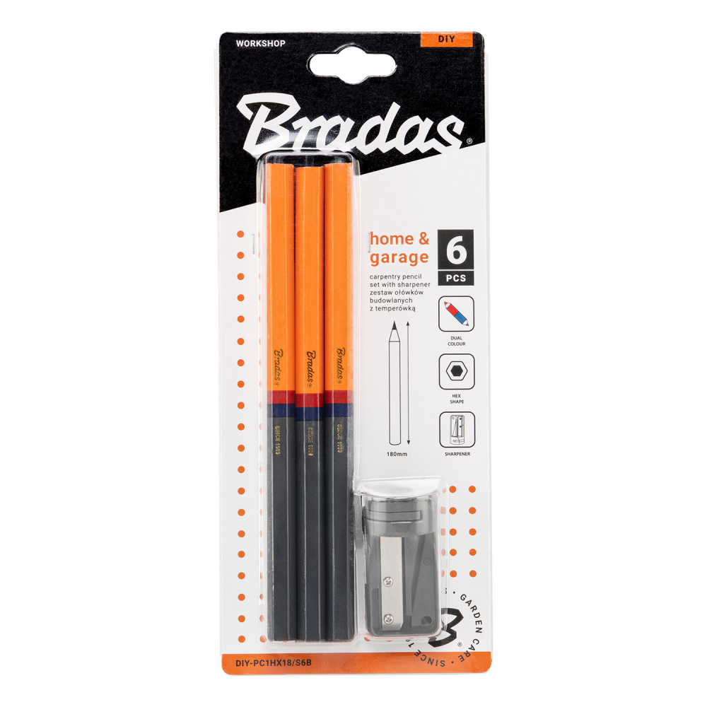 Das Bradas Zimmermannsbleistift-Set 180 mm HB mit ovaler Form und Anspitzer ist ideal zum exakten Markieren bei Bau-, Montage- oder Holzarbeiten.