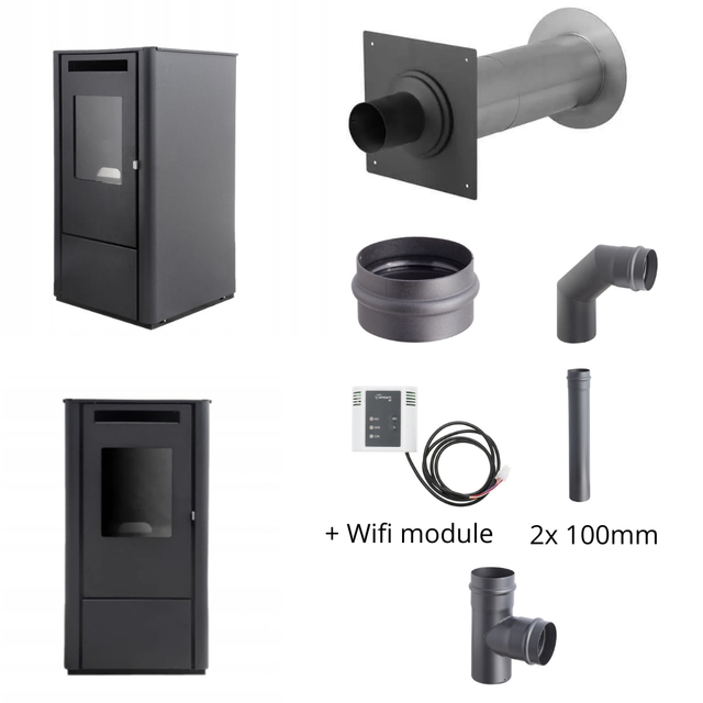 Ferretti Milano 9 kW Schwarz mit Wi-Fi – Wanddurchführung schwarz & Darco SPKP Abgas-Set